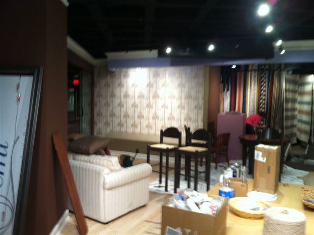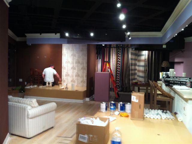 I wanted the space to act a bit like a home. So when you walked into the showroom you really felt you were experiencing a space you could live in. The wallpaper worked to tie all of this together and give it an additional dimension. And with Graham & Brown's paste the wall technique, you just had to stick it on. Granted . . . I was not the one that did the actual pasting of the wallpaper. But, my "workerbee" (boss) did say he was impressed with how easy and quick it was. Wish I could say the same for all the painting we did.